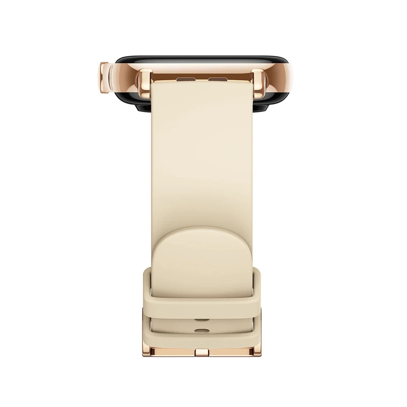 GTS 2 از بدنه مستطیلی با گوشههای خمیده (Curved Glass) و فریم آلومینیومی مات بهره میبرد. ابعاد آن 42.8 × 35.6 × 9.7 میلیمتر و وزن آن بدون بند تنها 24.7 گرم است؛ این وزن فوقالعاده کم باعث میشود حتی بعد از ساعتها استفاده، احساس خستگی نکنید. صفحه نمایش با شیشه 3D خمیده پوشیده شده و حس یک ساعت لوکس را منتقل میکند.