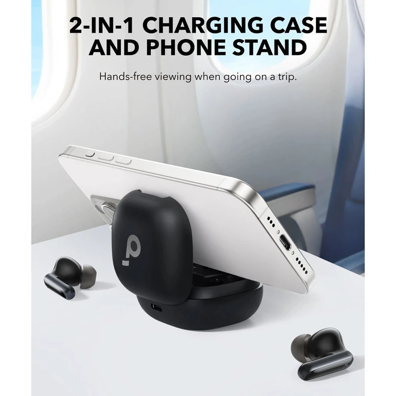 بلوتوث ۵.۳ اتصال پایدار با جفتشدن سریع (کمتر از ۲ ثانیه) و حداقل قطعی (حتی در محیطهای شلوغ) فراهم میکند، و حالت چندنقطهای (Multipoint) اجازه اتصال همزمان به دو دستگاه (گوشی + لپتاپ) را میدهد – هرچند تنظیم آن از طریق اپ الزامی است. حالت گیمینگ لتنسی را به ~۸۰ میلیثانیه کاهش میدهد، مناسب برای بازیهای موبایل. اپ Soundcore (رایگان برای iOS/Android) گزینههای پیشرفته مثل EQ، سفارشیسازی کنترلها، بهروزرسانی فریمویر، تست فیت و "Find My Device" ارائه میدهد. کیفیت تماس با ۶ میکروفون و الگوریتم AI خوب است (واضح در محیطهای آرام)، اما در باد یا نویز شدید، صداهای پسزمینه نفوذ میکند. استفاده از یک ایرباد تنها بدون مشکل کار میکند.