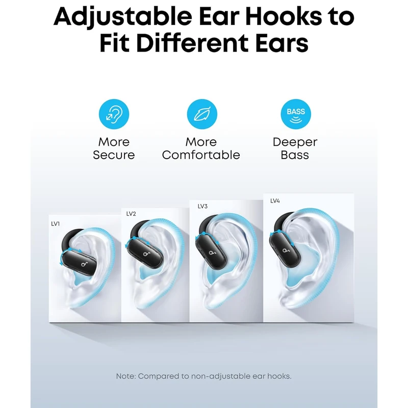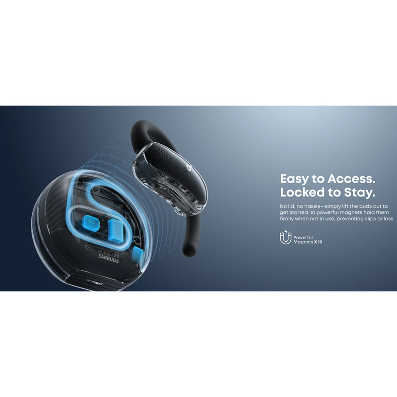 طراحی open-ear سبک با ear hooks 4 سطحی و کیس شفاف futuristic برای فیت محکم.