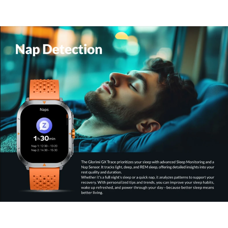 Glorimi GX Trace با بدنهای از آلیاژ روی تقویتشده و قاب مربعی ۵۳ میلیمتری (ابعاد ۵۳.۱ × ۵۳.۱ × ۱۴.۳ میلیمتر)، طراحی اسپرت و متمایزی دارد که وزن آن را به حدود ۶۰ گرم (با بند) محدود میکند و برای استفاده طولانیمدت، مانند ورزش یا خواب، راحت است. بند سیلیکونی ضدتعریق با عرض ۲۲ میلیمتر، قابل تعویض است و امکان شخصیسازی با بندهای چرمی یا فلزی را فراهم میکند، که این ویژگی تنوع ظاهری را افزایش میدهد.