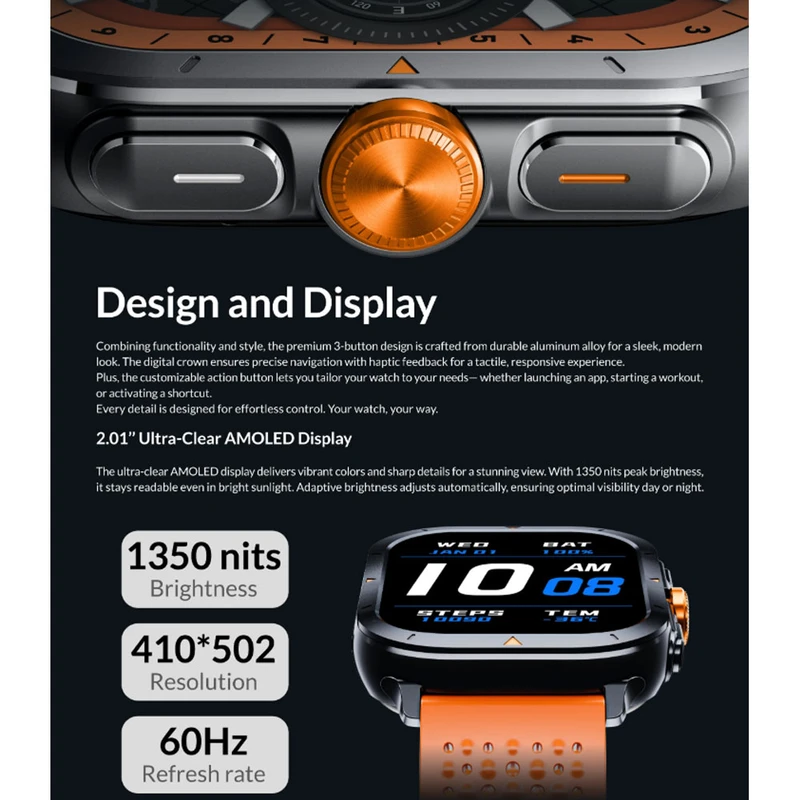 صفحهنمایش ۲.۰۱ اینچی TFT رنگی با رزولوشن ۴۸۰ × ۴۸۰ پیکسل و روشنایی بالا (تا ۶۰۰ نیت)، یکی از نقاط قوت اصلی است. این پنل رنگهای زنده، کنتراست مناسب و خوانایی عالی زیر نور مستقیم خورشید ارائه میدهد و از حالت Always-On Display (AOD) پشتیبانی میکند. شیشه مقاوم ۲.۵D در برابر خطوخش، ظاهری لوکس به ساعت میبخشد. استاندارد IP68 (مقاومت کامل در برابر گردوغبار و غوطهوری تا ۱.۵ متر به مدت ۳۰ دقیقه) آن را برای شنا، باران یا فعالیتهای outdoor ایمن میکند، هرچند برای غواصی عمیق مناسب نیست.