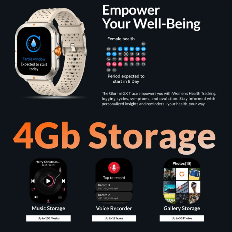 Glorimi GX Trace از بلوتوث ۵.۳ برای اتصال پایدار به گوشیهای اندروید ۶.۰+ و iOS ۱۱.۰+ استفاده میکند و اپلیکیشن GloryFit دادهها را به صورت گرافیکی و تحلیلی نمایش میدهد. سیستمعامل اختصاصی Glorimi OS با رابط کاربری روان، سریع و کاملاً به زبان فارسی (منوها، اعلانها و واچفیسها) است، که تعامل را برای کاربران ایرانی آسان میکند. قابلیت مکالمه بلوتوثی با میکروفون و اسپیکر داخلی، تماسها را با کیفیت صدای شفاف (در محیطهای آرام) و نویزکنسلینگ پایهای مدیریت میکند و پاسخ به اعلانها (مانند واتساپ، تلگرام و اینستاگرام) با کیبورد سریع یا پاسخهای آماده ممکن است.
