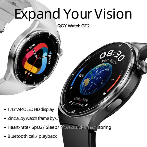 QCY GT2 از بلوتوث ۵.۳ (یا ۵.۲ در برخی نسخهها) برای اتصال پایدار به گوشیهای اندروید ۶.۰+ و iOS ۱۱.۰+ استفاده میکند و اپلیکیشن QCY دادهها را به صورت گرافیکی و تحلیلی نمایش میدهد. رابط کاربری روان، سریع و کاملاً به زبان فارسی (منوها، اعلانها و واچفیسها) است، که تعامل را برای کاربران ایرانی آسان میکند. قابلیت مکالمه بلوتوثی با میکروفون و اسپیکر داخلی، تماسها را با کیفیت صدای شفاف (در محیطهای آرام) و نویزکنسلینگ پایهای مدیریت میکند و پاسخ به اعلانها (مانند واتساپ، تلگرام) با کیبورد سریع یا پاسخهای آماده ممکن است.