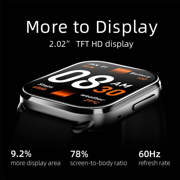 صفحه نمایش ۱.۹۵ اینچی AMOLED با رزولوشن HD (۴۱۰x۵۰۲ پیکسل) یکی از نقاط قوت اصلی است. این پنل نه تنها رنگها را زنده و واضح نمایش میدهد، بلکه از حالت Always On Display (AOD) پشتیبانی میکند تا اطلاعات کلیدی مانند زمان و ضربان قلب بدون لمس صفحه قابل مشاهده باشد. روشنایی صفحه تا ۶۰۰ نیت است، که در محیطهای خارجی عملکرد خوبی دارد. کلید فیزیکی سمت راست برای روشن/خاموش و ناوبری سریع عمل میکند و حس کیفیت ساخت را تقویت میکند. در کل، طراحی ارگونومیک و مقاوم در برابر رطوبت (استاندارد ۵ATM، مناسب برای شنا تا عمق ۵۰ متری) آن را به یک ساعت همهکاره تبدیل کرده است.