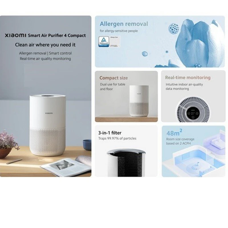 Xiaomi Smart Air Purifier 4 Compact کوچکترین و جمعوجورترین مدل از سری ۴ شیائومی است که برای فضاهای کوچک مانند اتاق خواب، دفتر کار یا اتاق کودک طراحی شده. این دستگاه با تمرکز بر تصفیه مؤثر، مصرف انرژی پایین و کنترل هوشمند، گزینهای عالی برای کسانی است که به دنبال دستگاهی سبک، کمصدا و هوشمند برای مقابله با گردوغبار، آلرژی و آلودگیهای روزمره هستند. نسبت به مدلهای بزرگتر مانند ۴ Lite یا ۴ Pro، CADR پایینتری دارد اما همچنان عملکرد خوبی در رده خود ارائه میدهد.