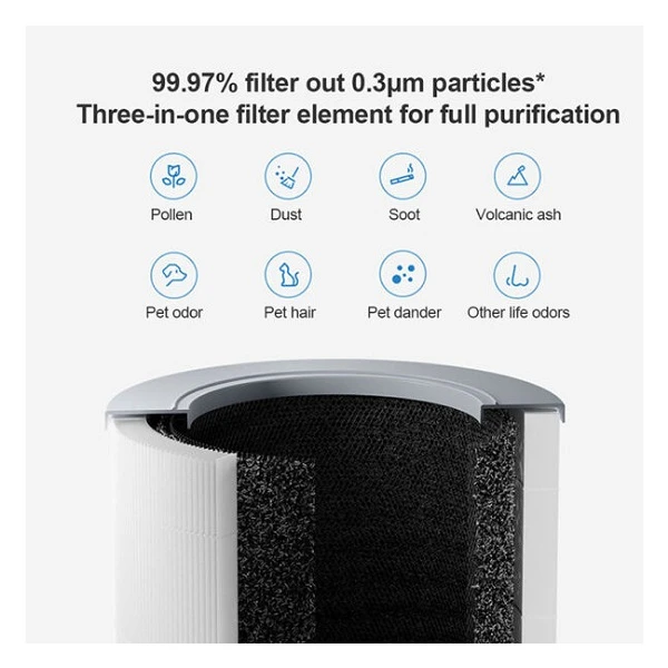 با CADR ذرات ۲۳۰ مترمکعب بر ساعت (حدود ۱۳۵ CFM)، دستگاه میتواند اتاقی ۱۶ تا ۲۷ متر مربع را در حدود ۱۲-۱۵ دقیقه کامل تصفیه کند (بر اساس تستها، برای اتاقهای تا حدود ۱۹ متر مربع عملکرد بهینه دارد). فیلتر سهلایه یکپارچه (پیشفیلتر، فیلتر High-Efficiency با کارایی ۹۹.۹۷٪ برای ذرات ۰.۳ میکرون و حتی ۰.۱ میکرون، و لایه کربن فعال) ذرات PM2.5، گرده، گردوغبار، مو و شوره حیوانات خانگی، دود و برخی بوها را به خوبی حذف میکند. ترکیب فناوری الکترواستاتیک و مکانیکی اجازه میدهد فیلتر با مصرف انرژی کمتر، همان کارایی را داشته باشد. سنسور لیزری PM2.5 کیفیت هوا را به صورت واقعیزمان اندازهگیری میکند و حالت Auto سرعت فن را تنظیم میکند. در تستها، کاهش PM2.5 به نزدیک صفر و عملکرد عالی در کاهش گردوغبار و آلرژنها نشان داده شده. گواهی TÜV Rheinland برای کنترل آلرژی تأییدکننده عملکرد آن است.